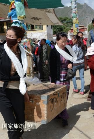 國家旅游地理 西藏拉薩8月9日訊 8月6日,在西藏堆龍德慶縣乃瓊鎮(zhèn)甲熱村,覺木隆藏戲團團長瓊達(前右)在演出后和團員一起搬運道具。藏戲是藏族人民喜聞樂見的藝術(shù)形式,而發(fā)源于甲熱村(舊稱覺木隆)的覺木隆藏戲在藏戲各流派中流傳最廣。