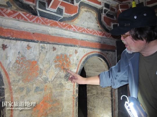 國家旅游地理 陜西延安9月15日訊 9月14日,考古學(xué)家正在查看畫像磚墓內(nèi)的壁畫。經(jīng)過近三個月的緊張工作,陜西省考古學(xué)家日前在陜西延安配合基建時,首次對一座宋金時期大型畫像磚墓進行了科學(xué)考古發(fā)掘。發(fā)現(xiàn)這座畫像磚墓竟是仿木磚結(jié)構(gòu)多室墓,對了解和研究陜北畫像磚墓形制、建筑結(jié)構(gòu)及其分布與內(nèi)容等,具有重要的標(biāo)尺性意義。 /新華社記者馮國攝