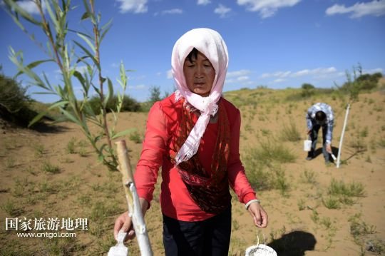 國家旅游地理 寧夏銀川10月11日訊 圖為顧蕓香(8月14日攝) 14年來,寧夏靈武農(nóng)民顧蕓香的心,不知隨著沙漠里的樹“生生死死”了多少回。