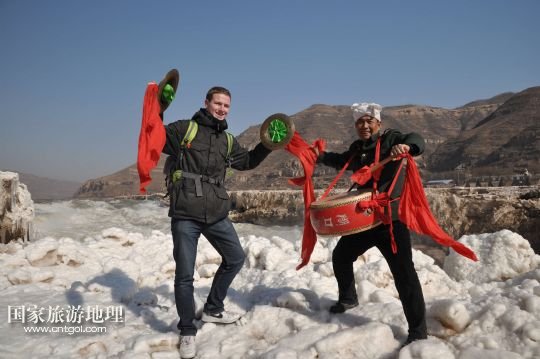 國(guó)家旅游地理 陜西延安1月26日訊 1月25日,一名游客在黃河壺口瀑布景區(qū)與民俗演員合影留念。當(dāng)日,受凌汛影響一度關(guān)閉的黃河壺口瀑布景區(qū)重新開放迎賓,游客可近距離欣賞“冰瀑玉壺”的壯麗景觀。 /新華社發(fā)(呂桂明 攝)