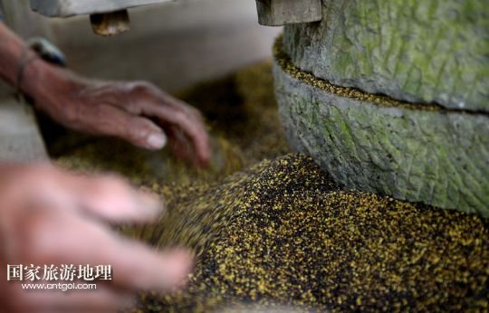 6月21日,在湖北省宣恩縣箭竹坪村的榨油房里,“打榨佬”們用牛拉石碾子將菜籽碾細(xì)。