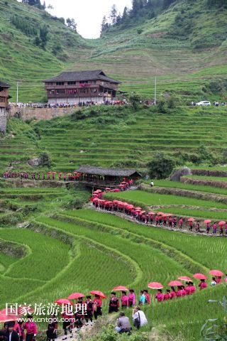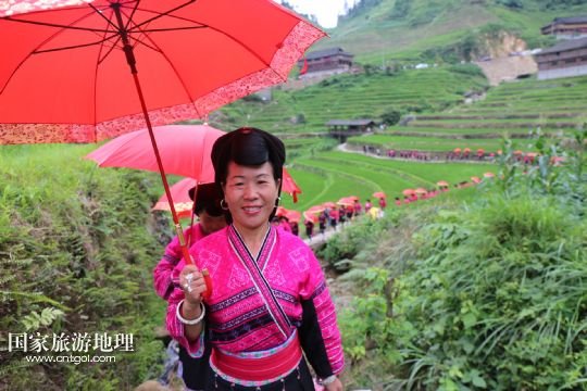 每年農(nóng)歷五月十四日、十五日是廣西桂林龍勝各族自治縣泗水鄉(xiāng)潘內(nèi)瑤寨紅瑤同胞與親朋好友聚會(huì)的日子,亦稱當(dāng)?shù)噩幷?ldquo;紅衣節(jié)”。紅瑤同胞相約在這期間開展唱瑤歌、評(píng)寨花、傳統(tǒng)刺繡、打旗公等傳統(tǒng)特色活動(dòng)。紅瑤是瑤族的一個(gè)支系,因喜穿紅色衣服而得名。 /新華社發(fā)(石農(nóng)兵 攝)