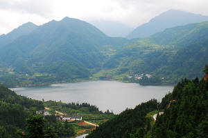泛舟湖上,但見(jiàn)山環(huán)水繞,峰回路轉(zhuǎn)。放眼望去,其山巒遠(yuǎn)近高低,有翠屏而立者,有碧螺而旋者,有柱石擎天者,有丘陵迤儷者。如遇晴日,藍(lán)天白云,碧樹(shù)紅花,映入湖面,靜則含蓄,動(dòng)則朦朧。間以飛泉滴流,鳥(niǎo)鳴魚(yú)躍,詩(shī)情畫(huà)意,油然而生。湖壩之下,又是另一番景色。亂石突兀,三里成堆,溪流汩汩,清泉淙淙,游人入其間,采一束野花,掬一捧河水,或臥或息,或濯或浴,仰視云海變幻,聚散離合,無(wú)不心曠神怡。