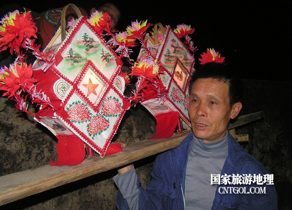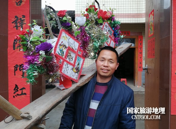 中年村民肩抬慶燈準備去接“龍”。鄒善水 攝