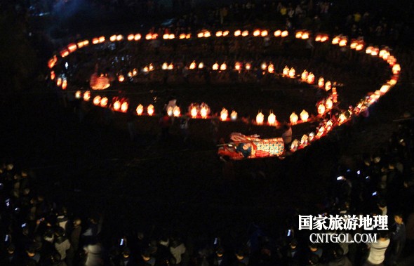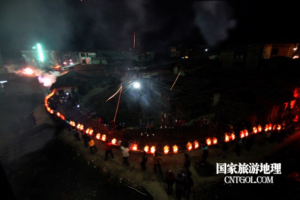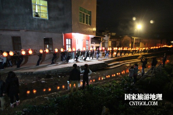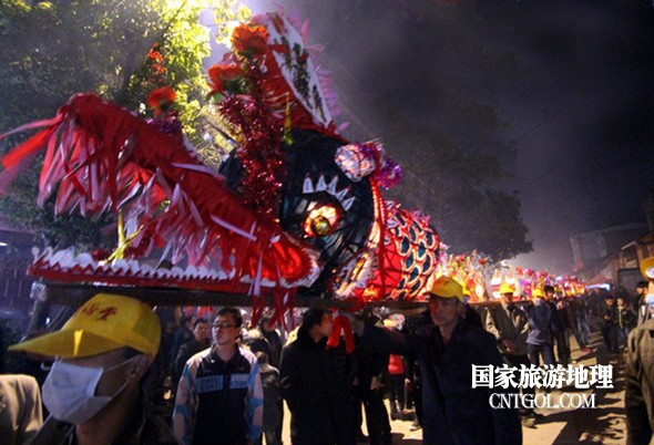 2月18日入夜,春雨霏霏。在光裕堂祖祠祭龍頭畢,鄒姓村民紛紛肩抬慶燈到祖祠接成220多米長的“龍”身。三聲銃響,游龍時而在村間慢悠游弋,時而在村道滯拔狂走,火紅的燭光伴著霏霏春雨,讓慶燈“龍”絢麗多姿,展示了“紙包火”的奇跡。 游“龍”所經(jīng)之處,鞭炮和禮花聲不絕于耳,祈求五谷豐登、吉祥如意。街巷人山人海,熱鬧非凡,一派花燈游龍慶豐收狂歡鬧元宵盛況。 吸引了海內外游客及四鄰八鄉(xiāng)的萬余群眾紛紛前往觀看。
